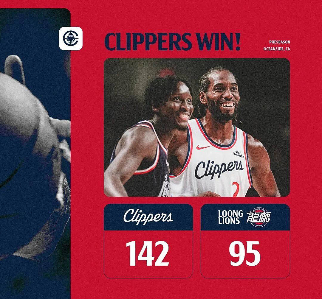 北京时间10月10日,NBA季前赛中,洛杉矶快船以142-95的比分大胜广州龙狮,领先对手整整47分。广州队外援奥拉迪波表现不俗,12投命中8球,贡献了24分、5个篮板、2次助攻和2次抢断;国内球员方面,陈国豪得到了13分和5个篮板,刘颜诚贡献12分,管子煜拿下6分。而快船队中,全场得分最高的是伦纳德,他出战18分钟得到18分和2次助攻。
